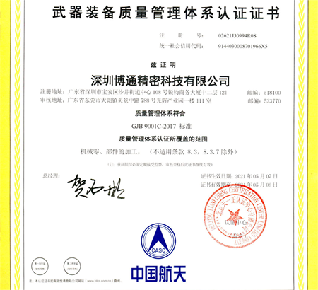 深圳市創思維企業管理技術服務有限公司輔導深圳博通順利通過GJB 9001C-2017武器裝備質量管理體系認證與ISO9001質量管理體系認證兩項認證。