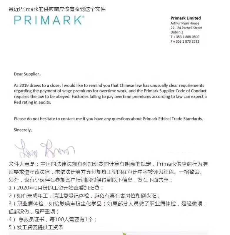 文件大意是:中國的法律法規有對加班費的計算有明確的規定, Primark供應商行為準則要求遵守該法律,未依法計算并支付加班工資的在審計中將被評為紅色。一招致命,另外,也有小伙伴在參加客戶培訓的時候得到以下信息,發在下面共享: